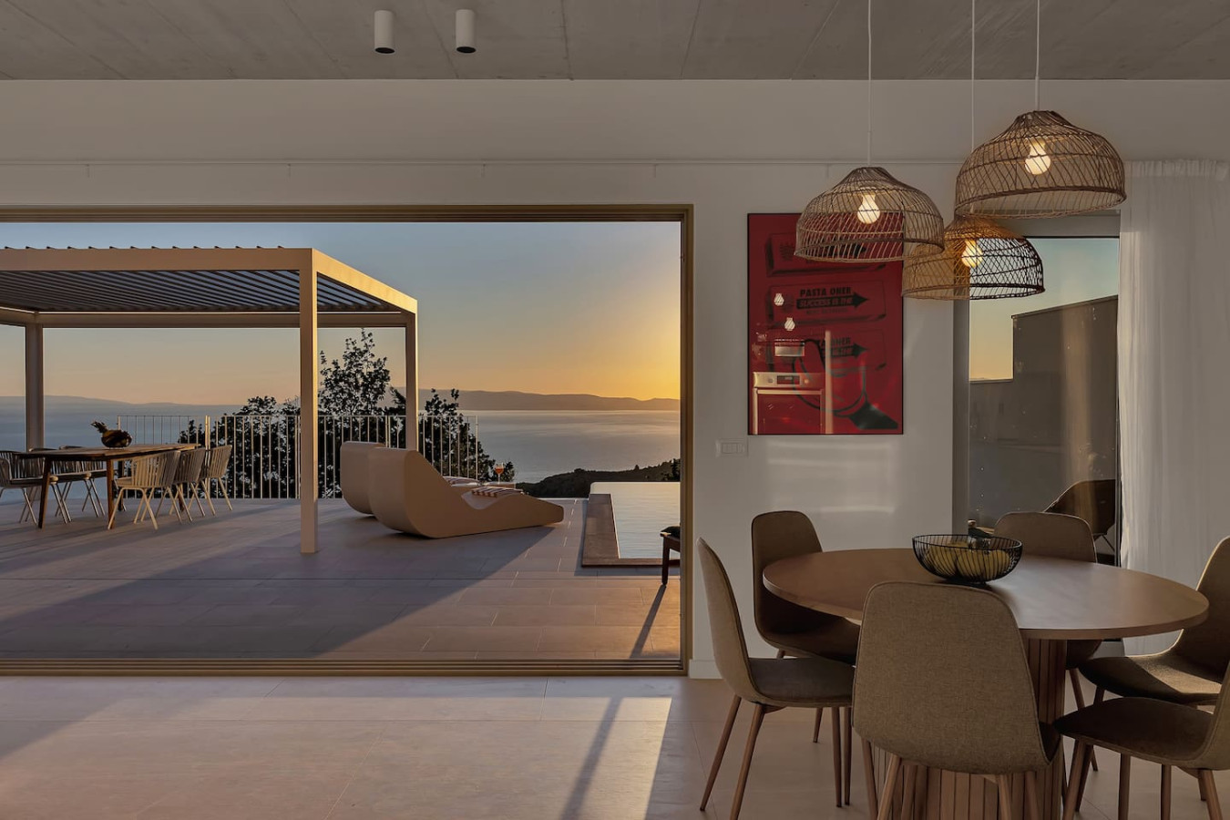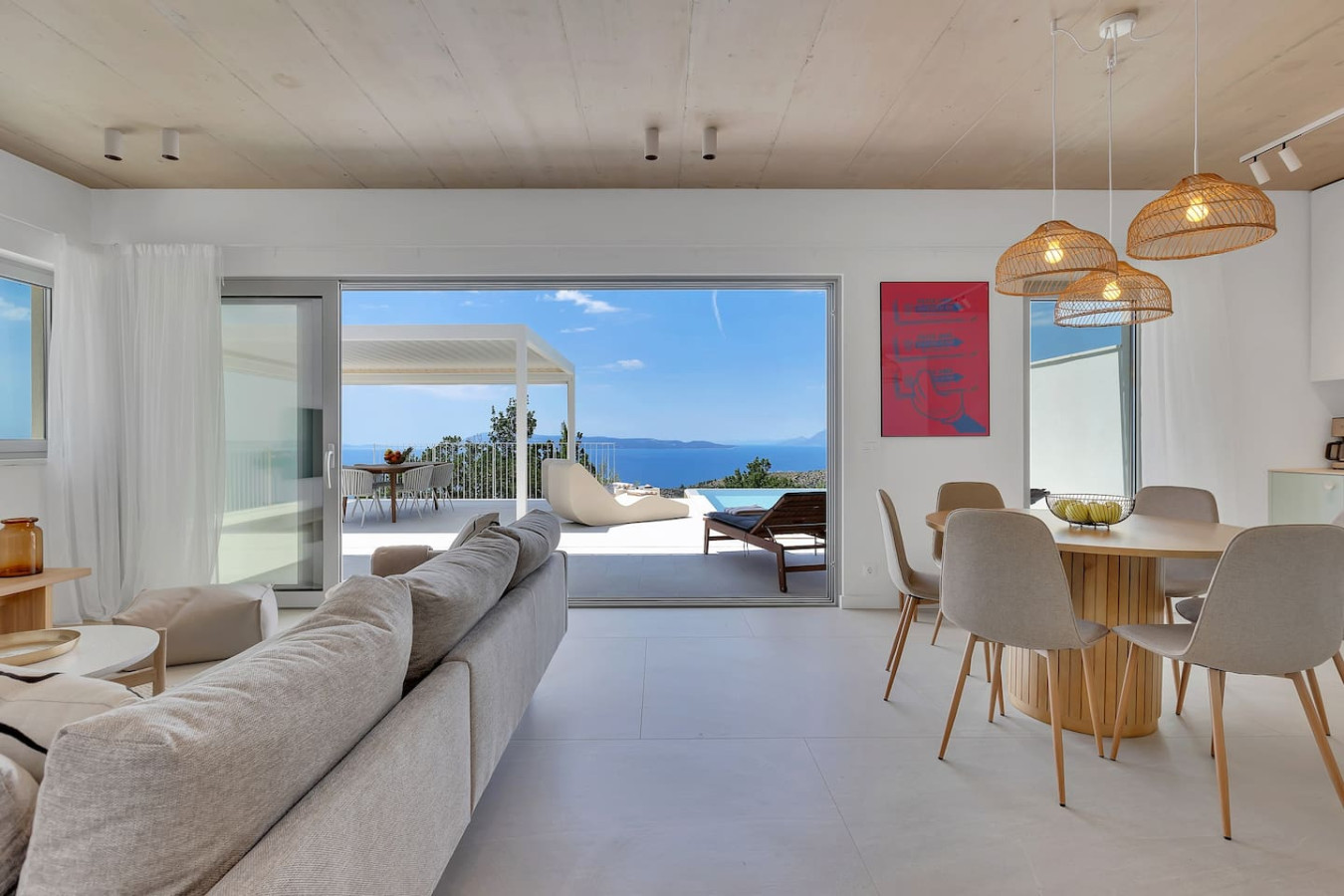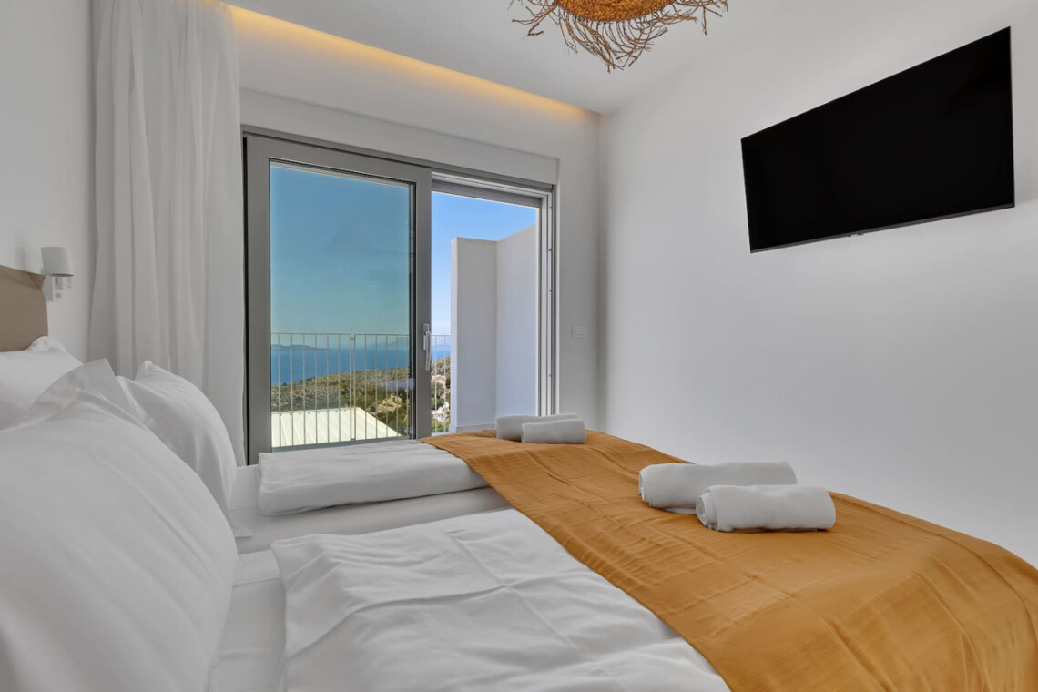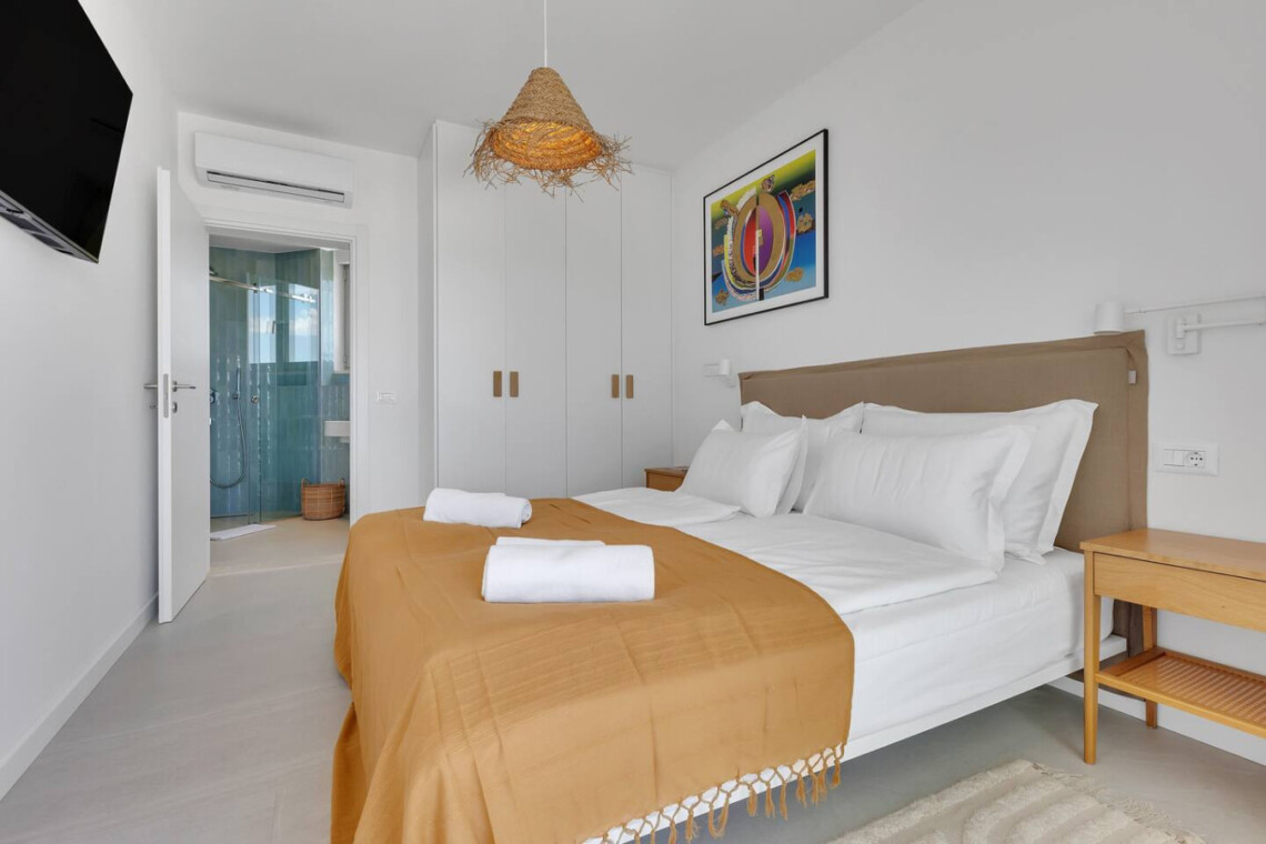 Im Inneren erwarten Sie großzügige Wohnbereiche, eine moderne, voll ausgestattete Küche sowie stilvoll eingerichtete Schlafzimmer, die höchsten Komfort bieten. Bodentiefe Fenster sorgen für lichtdurchflutete Räume und eröffnen einen atemberaubenden Panoramablick auf die Küste.