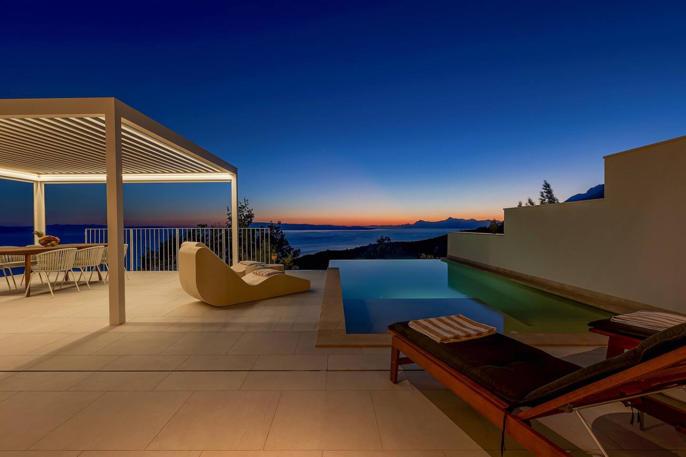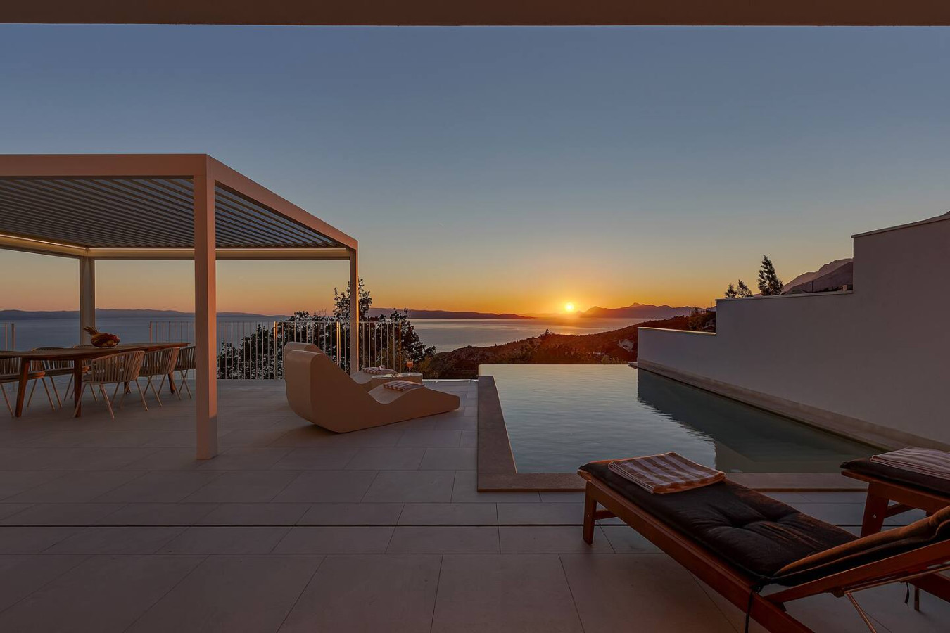 Der Außenbereich ist ein echtes Highlight: Ein privater Infinity-Pool, umgeben von einer eleganten Sonnenterrasse und gemütlichen Lounge-Bereichen, lädt zum Entspannen ein. Mediterrane Gartenanlagen runden das luxuriöse Ambiente ab und schaffen eine Oase der Ruhe.