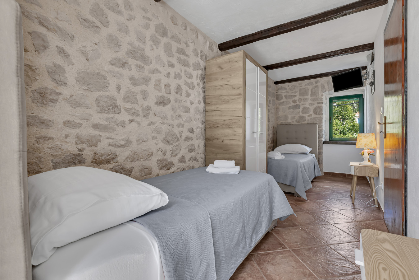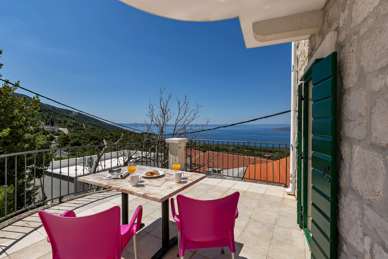 Bardzo przyjazny i pomocny gospodarz. Zawczasu dzwnił upewniając się kiedy będziemy. Mieliśmy opóźnienie i przyjechaliśmy późno w nocy, a mimo to przyjął nas serdecznie i czekał na nas przy drodze by pokazać jak jechać. Zawsze szybko odpowiada na pytania. Miejsce jest pięknie położone. Duże okno z jadalni z widokiem z wysoka na morze i wyspę robi wrażenie. Dom położony jest na zboczu u podnórza gór Biokovo (są szlaki górskie obok). Z jednej strony mamy widok na góry, a z drugiej na morze. Dzieci moje uwielbiały basen. Okolica bardzo spokojna. Samochodem można podjechać na 20 metrów od wejścia by wypakować bagaże, a potem parkuje się około 50 metrów niżej. Przyjechaliśmy dużym samochodem i nie było problemu z parkowaniem. Do plaży jedzie się samochodem 5 minut. My parkowaliśmy przy porcie w miejscowości Promajna zjeżdżając do niego pierwszym zjazdem przy lesie – 2Euro za godzinę w weekend, a na tygodniu był bezpłatny, bo nikt nie zbierał opłat. Bardzo polecam to miejsce i gospodarza.