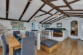 Lækkert og charmerende udeområde med pool (ca 8 x 4 meter) og god udendørs spiseplads, overdækket bar, og indendørskøkken i annex i forbindelse med udeområdet. Der er derudover et køkken på øverste etage i hovedhuset.